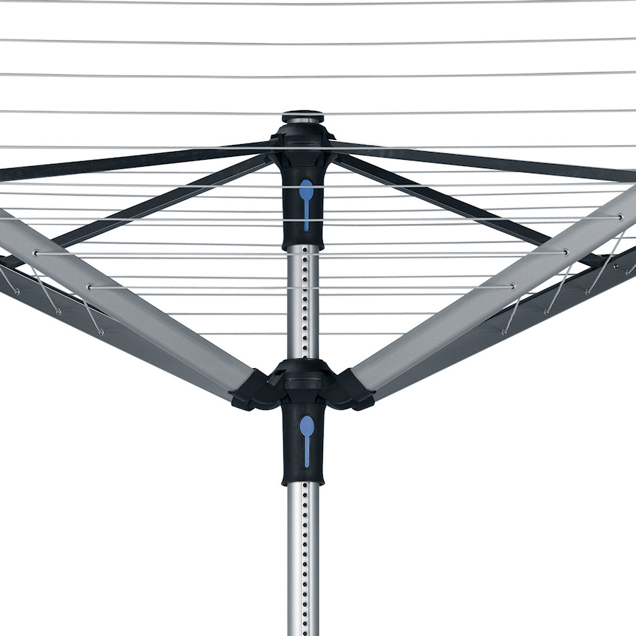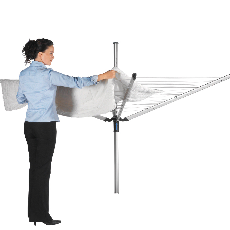 Zastosowanie 4 ramion w suszarce daje nam bardzo dużo miejsca na wieszanie ubrań - jest to w sumie 50 m linek, które dodatkowo zostały pokryte antypoślizgowym tworzywem. Suszarkę możemy dowolnie obracać, nawet przy pełnym obciążeniu - z jednego miejsca rozwieszamy całe pranie.