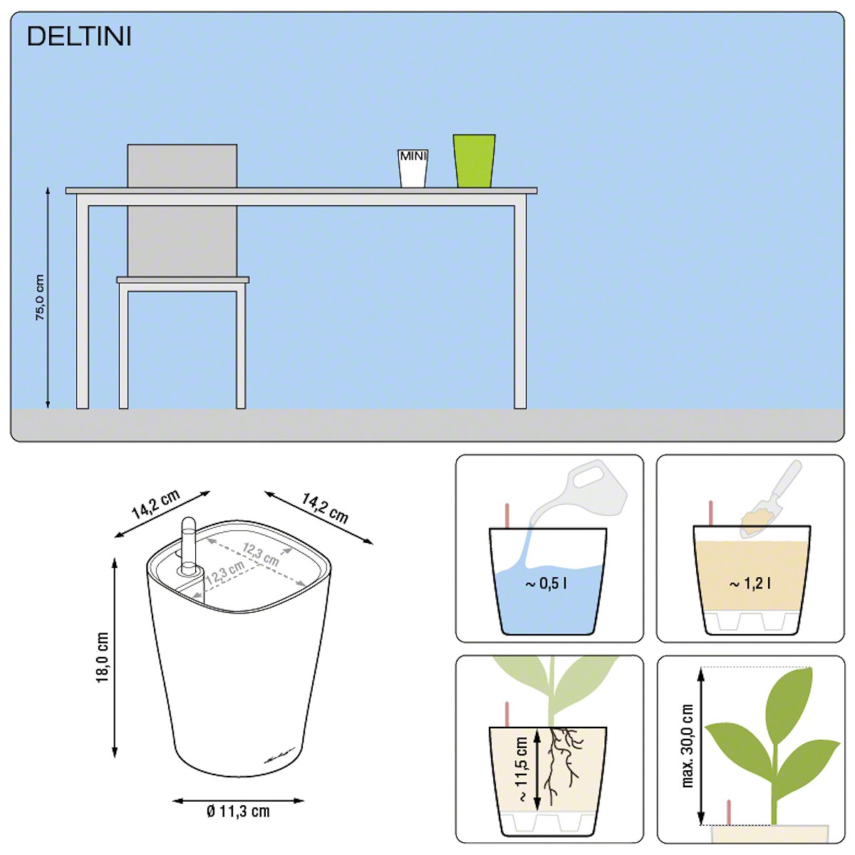 Doniczki z serii Deltini łatwo utrzymać w czystości. Do czyszczenia wystarczy użyć szmatki nasączonej wodą z płynem do mycia naczyń. Używanie silnych detergentów jest wręcz nie wskazane.