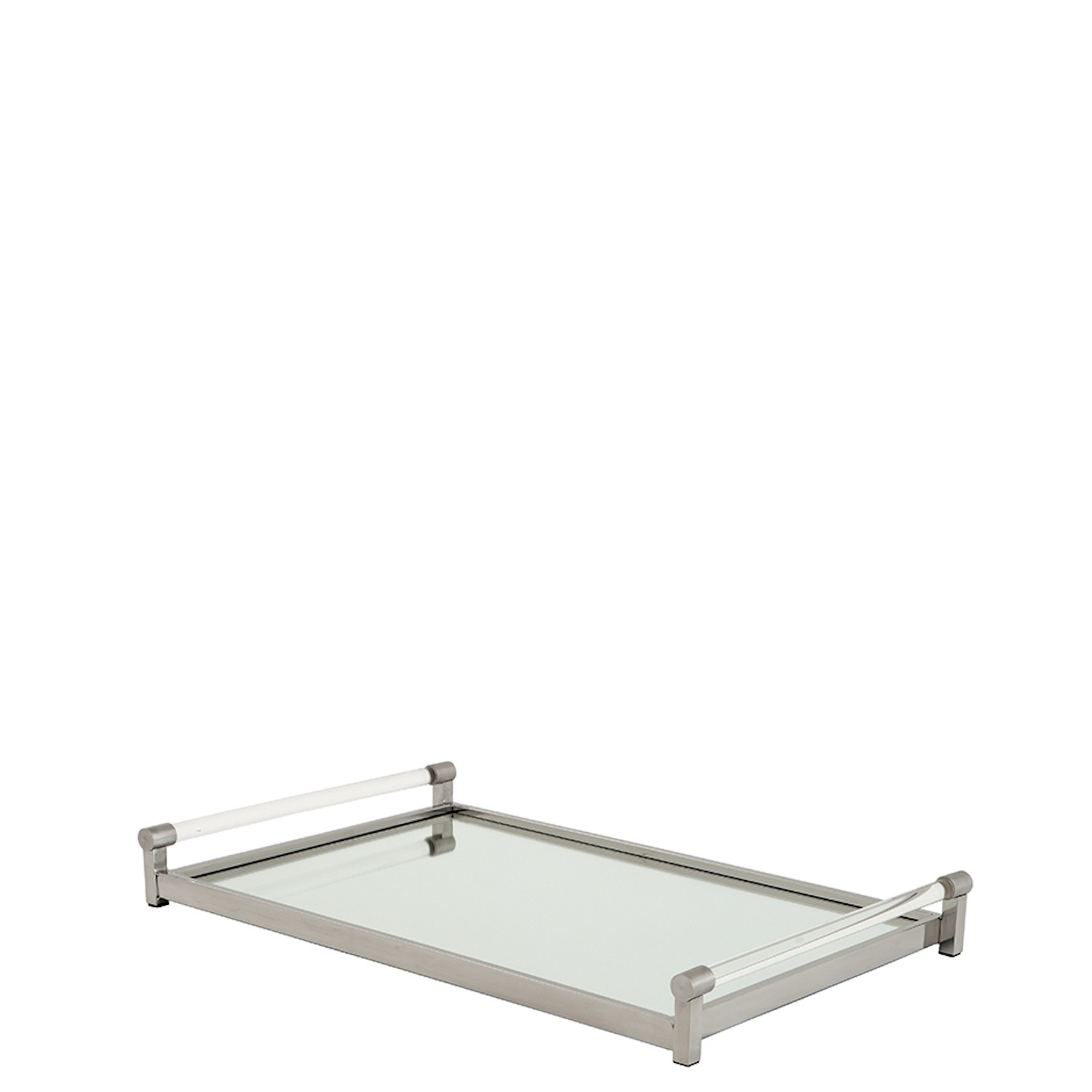 lustrzanym szkłem. Przedmiot posiada również szklane, okrągłe rączki zakończone stalowymi elementami. Na tacy doskonale będą się prezentować