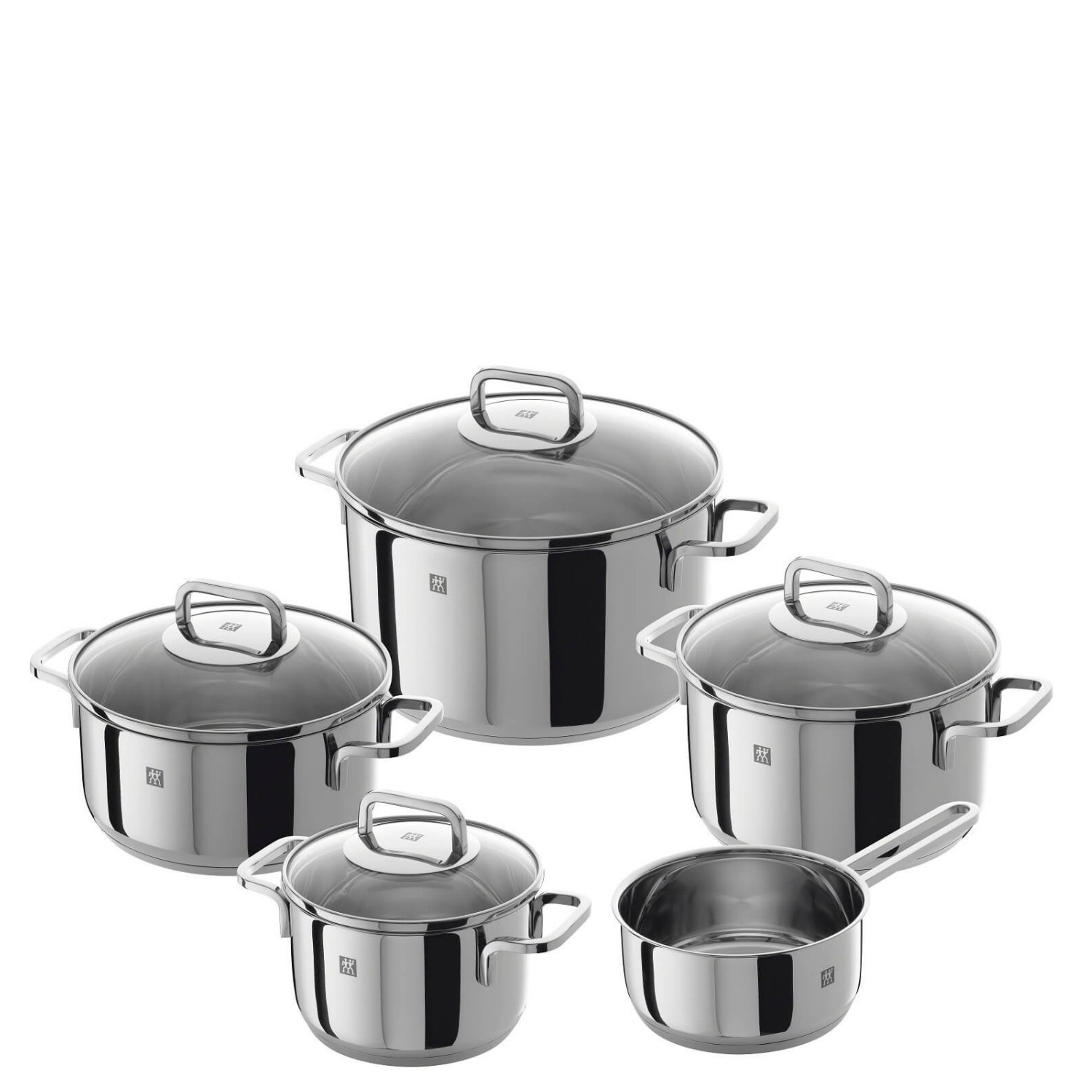 Pięcioczęściowy zestaw naczyń kuchennych z linii Zwilling® Quadro składa się trzech garnków wysokich o średnicach 16, 20 i 24 cm, niskiego garnka o średnicy 20 cm oraz jednego rondla – 16 cm. Poza rondlem, wszystkie garnki wyposażone są w idealnie dopasowane szklane pokrywki.