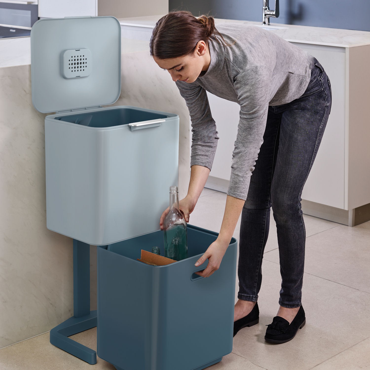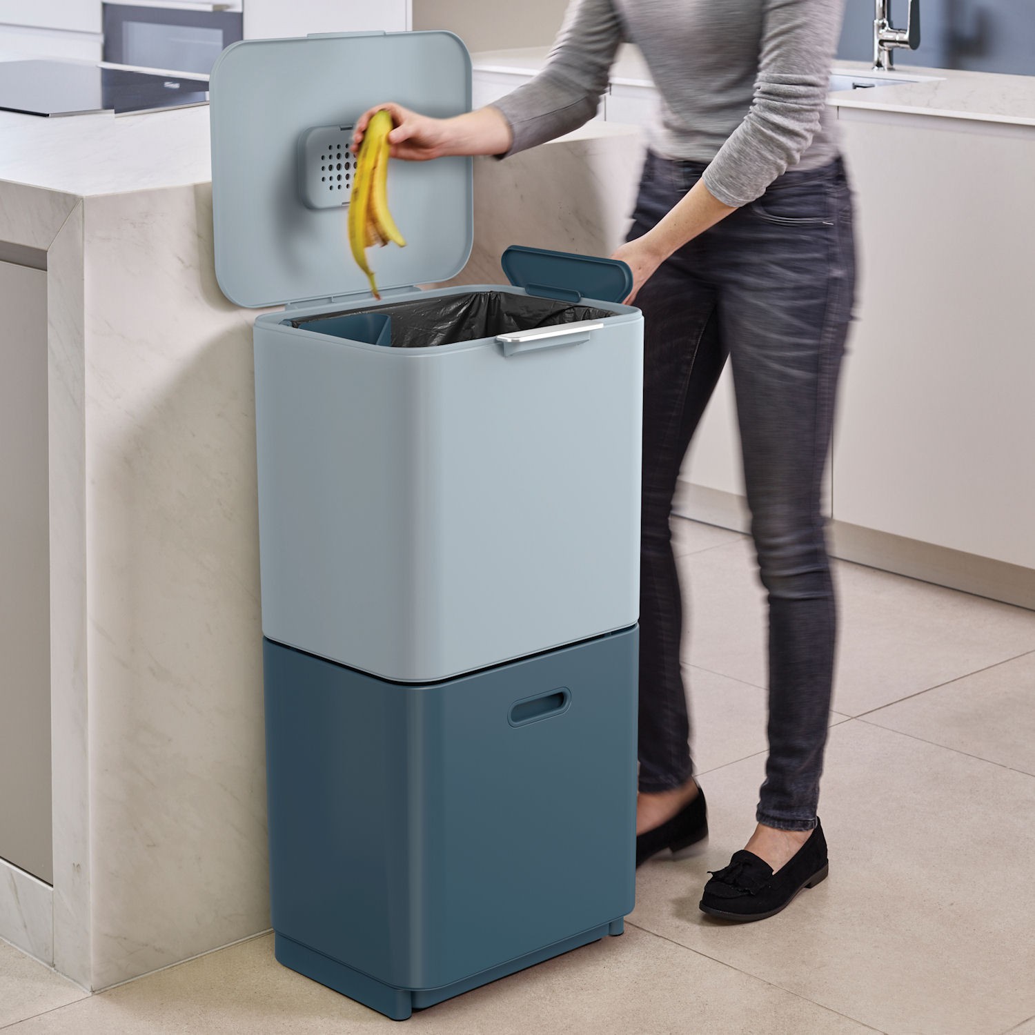 - wyjmowany pojemnik (4 l) na odpadki organiczne z pokrywką – można stawiać go na blacie, a pokrywkę zawiesić na krawędzi kosza,