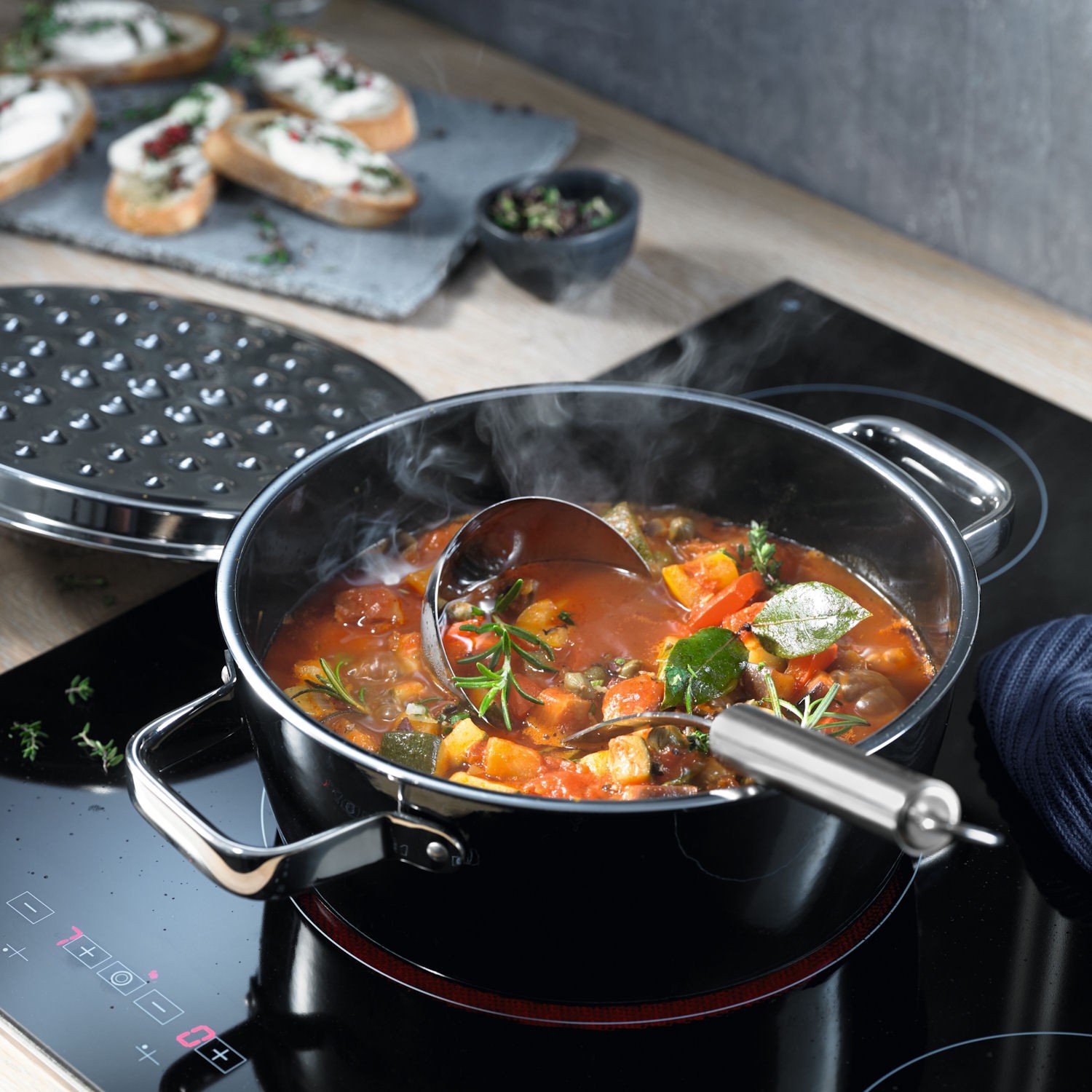 pokrywka ze stali nierdzewnej z fakturowanym spodem, który zwiększa ilość skroplonej pary wodnej wpływając na bardziej równomierne gotowanie,