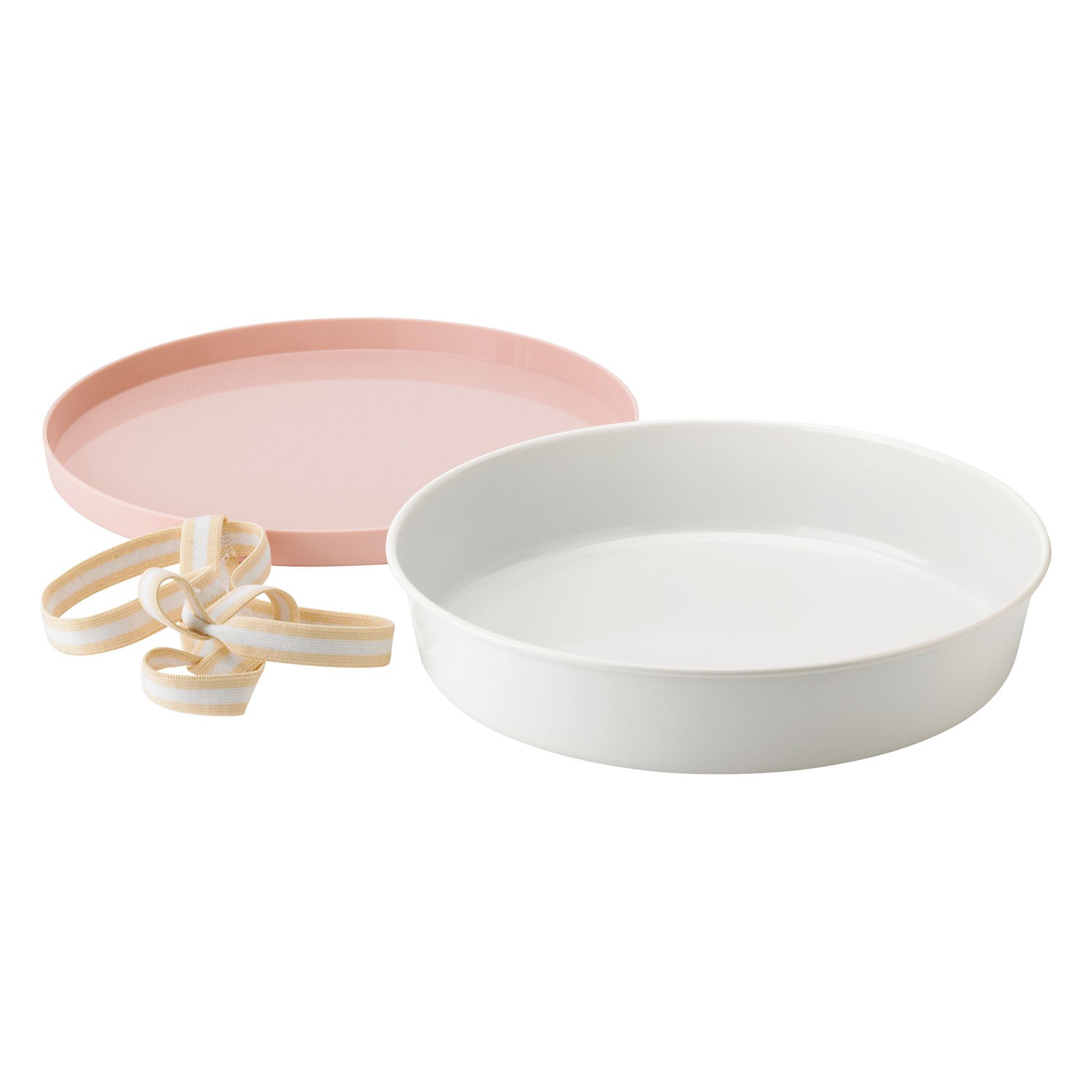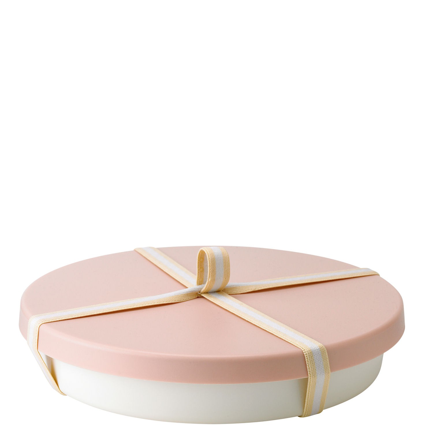 Biały pojemnik jest okrągły, wyposażony w różowe wieko. Te dwa elementy oplata elastyczna biało-żółta opaska. Łatwo utrzymać w czystości, przeznaczony do żywności.