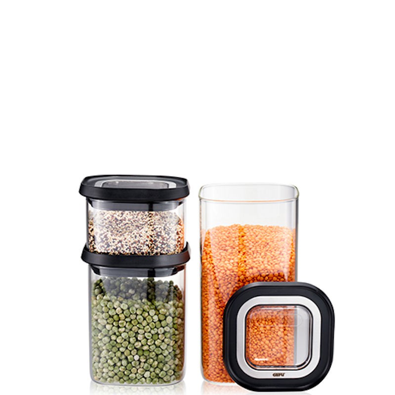 Pojemniki do przechowywania z serii PANTRY marki Gefu. Pojemniki wyposażone są w silikonową uszczelkę w pokrywce dzięki czemu można przechowywać żywność bez przedostawania się zapachów. Wykonano je z żaroodpornego i wytrzymałego szkła borokrzemianowego dzięki czemu są bardzo wytrzymałe i łatwe w utrzymaniu czystości. Pojemniki można układać w stos tak aby nie zabierały miejsca w szarce lub blacie roboczym.