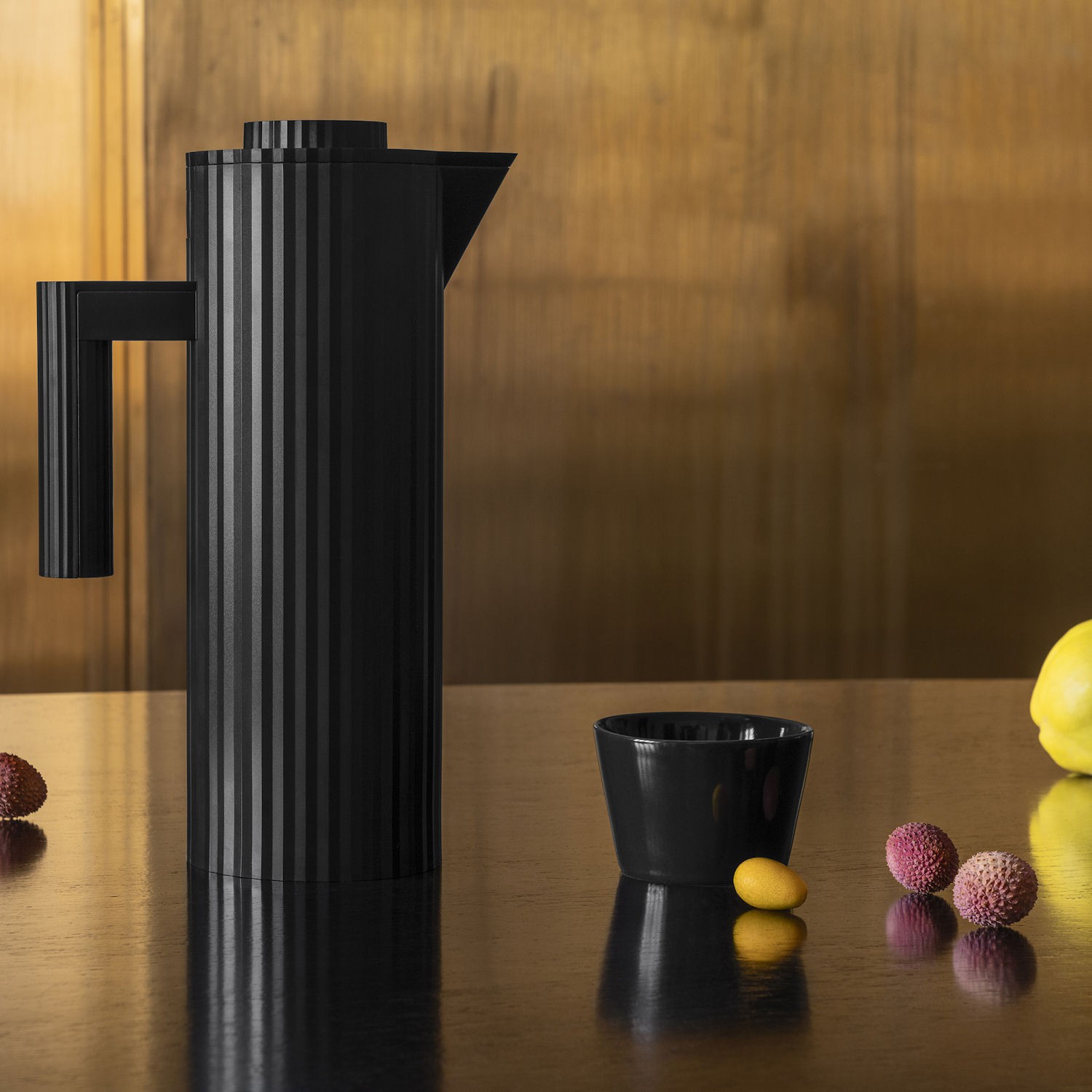Wyrafinowana draperia ubiera ten termoizolacyjny dzbanek zaprojektowany przez Michele De Lucchi: zwięzłe geometryczne linie i uważna kompozycja elementów, łącząca w obiekcie wymagania techniczne- wysoką wydajność i elegancję krawiectwa.