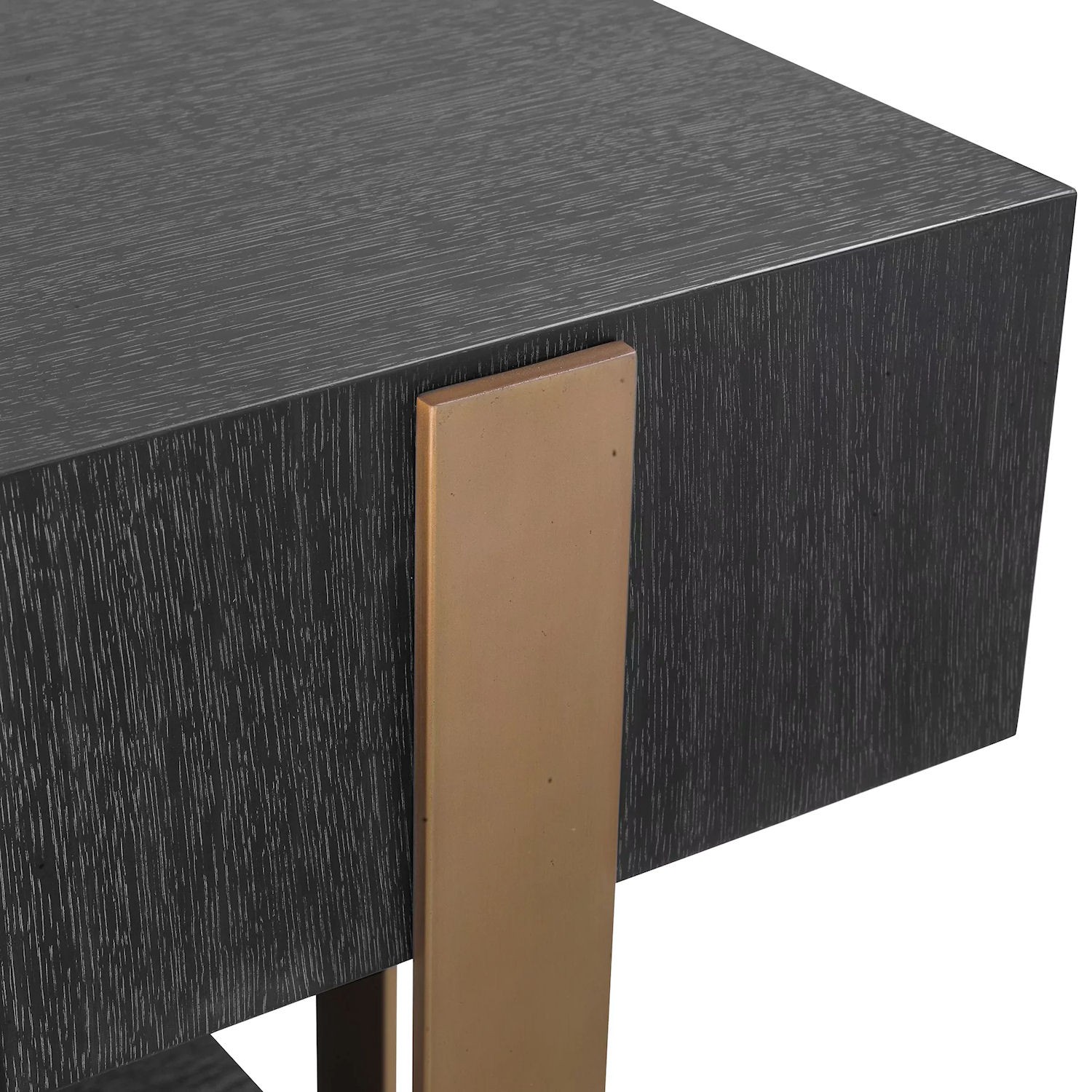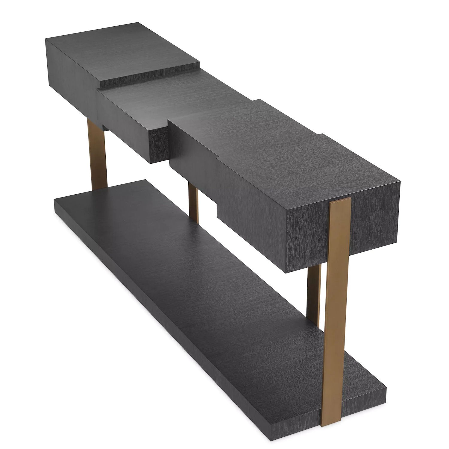 Nadaj swojemu przedpokojowi lub salonowi prawdziwie nowoczesnego charakteru dzięki stolikowi Nerone. Ten niezwykle stylowy i zaskakująco funkcjonalny mebel został wykonany z forniru dębowego w kolorze szarym i szczotkowanego mosiądzu. Ćwiartowany blat o różnych poziomach nadaje tej konsoli modny wygląd.