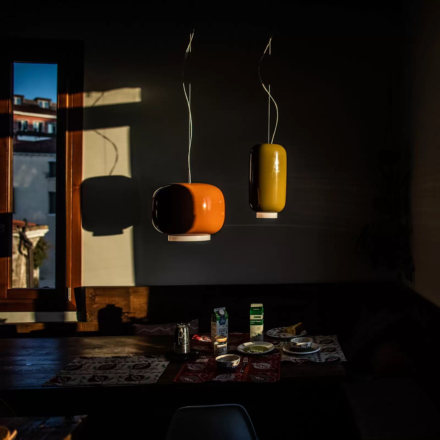 Lampa włoskiej marki Foscarini z kolekcji Chouchin. Z tej serii można wybrać kilka pojedynczych lamp, zawiesić je pojedynczo lub w zestawie. Lampa wykonana jest ze szkła dmuchanego oraz metalu.