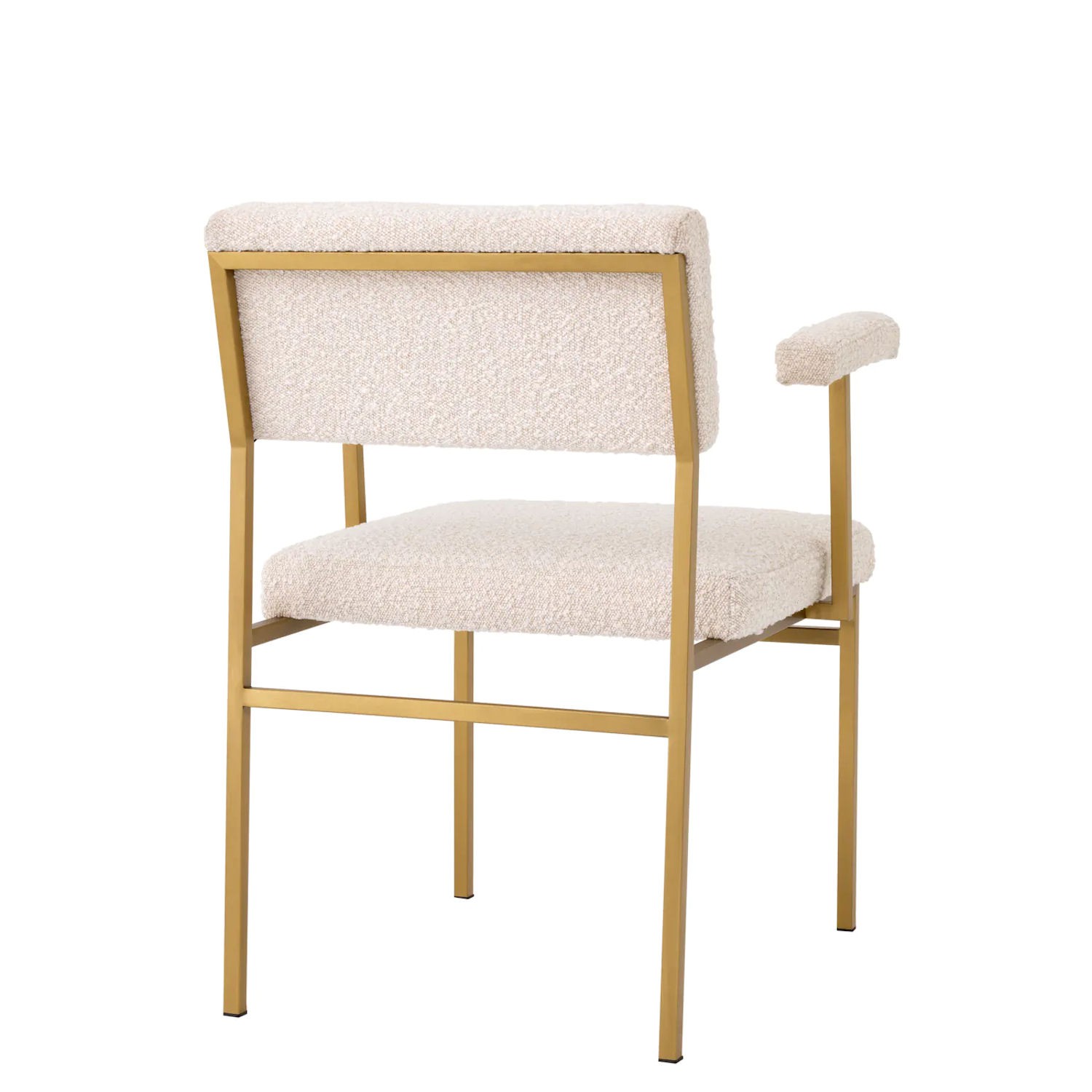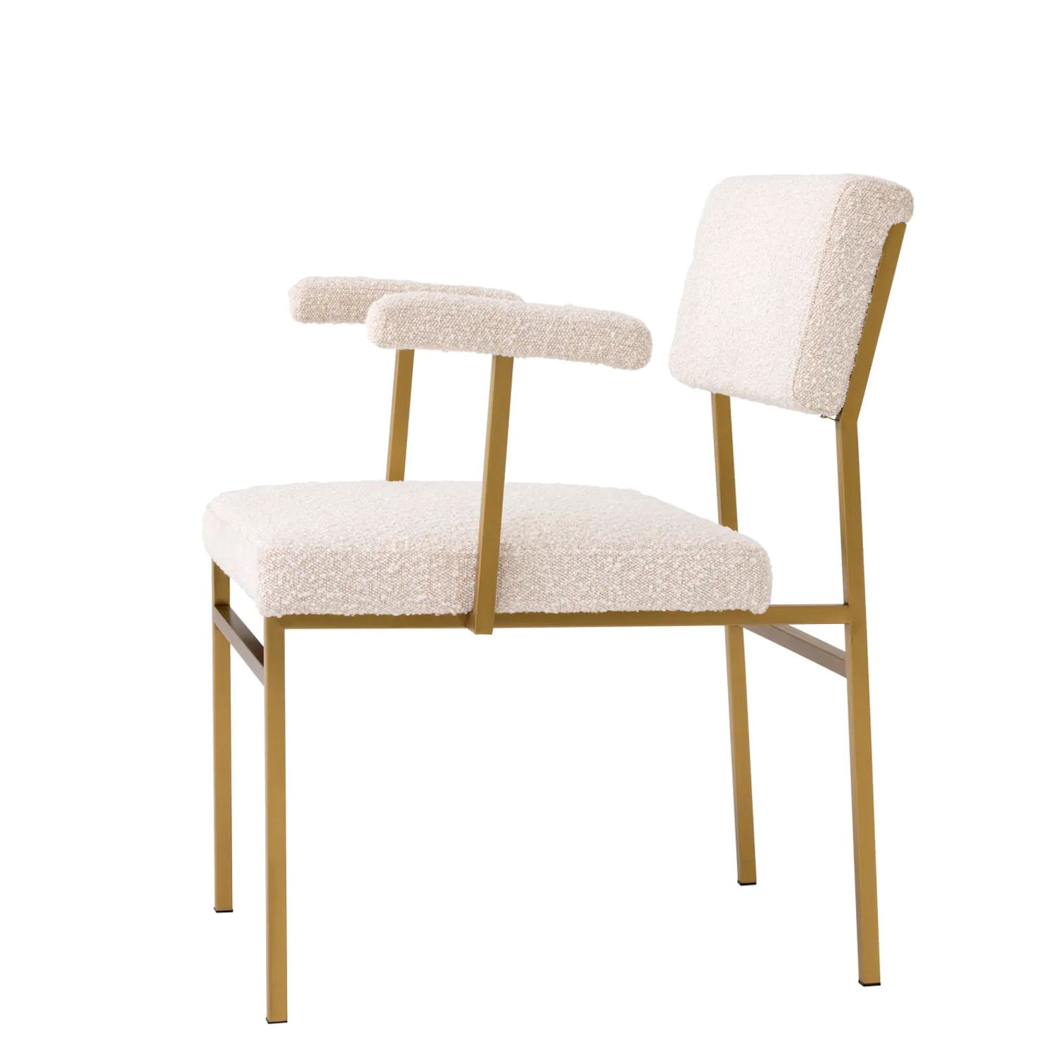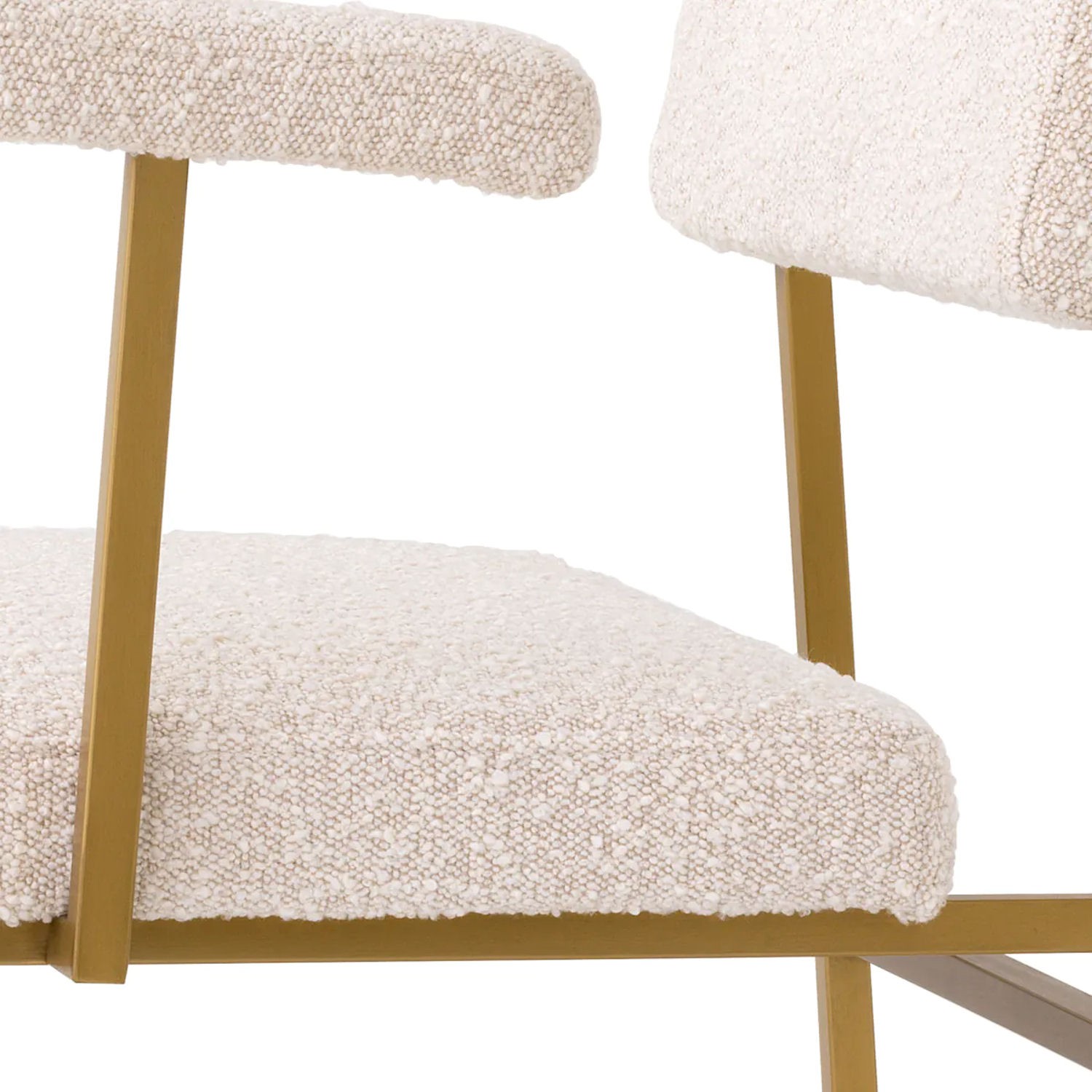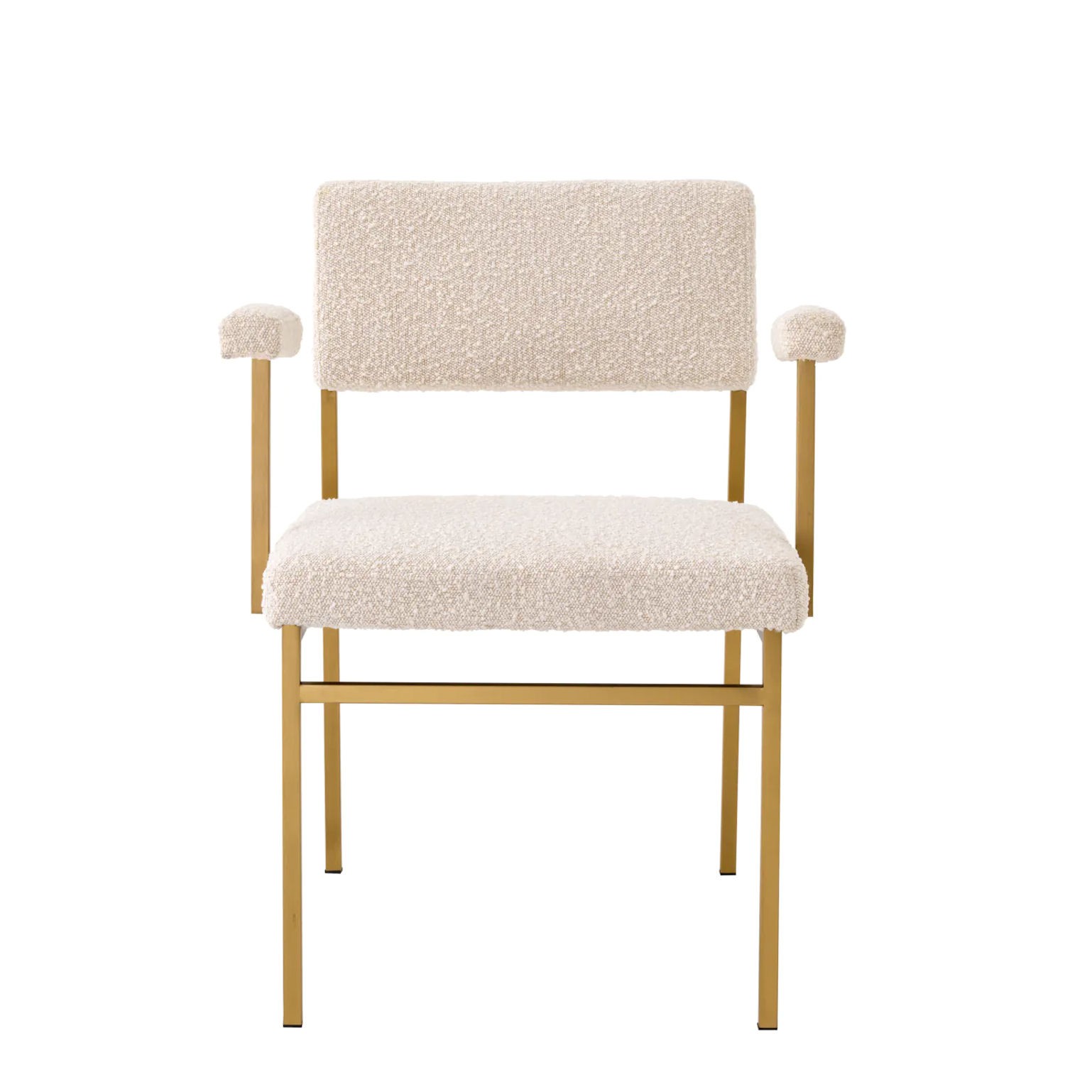 Dodaj odrobinę skandynawskiego stylu retro do swojej jadalni lub sypialni dzięki fotelowi Dunmore. Dzięki prostemu designowi fotel ten idealnie pasuje do wnętrz minimalistycznych i w stylu japandi. Miękka w dotyku kremowa tapicerka bouclé tworzy intrygujący kontrast w porównaniu z elegancką metalową ramą ze szczotkowanym mosiężnym wykończeniem.