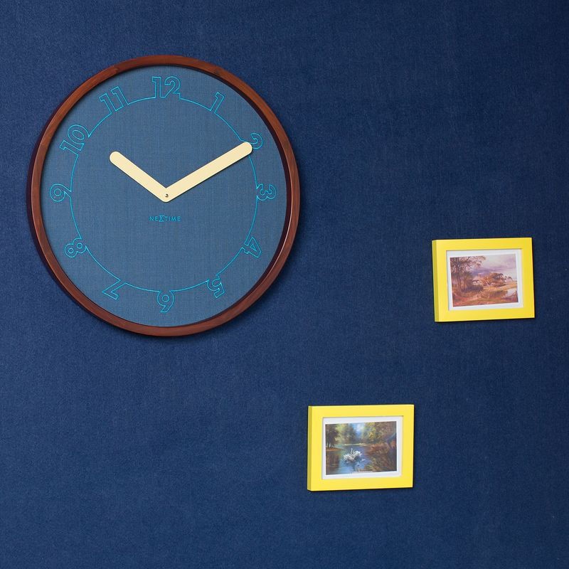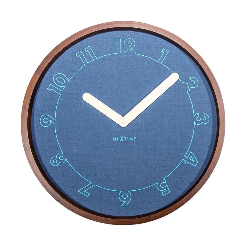 Posiada mechanizm płynący zasilany za pomocą baterii typu AA. Zegar wykonany z drewna i tkaniny, w kolorze niebieskim.