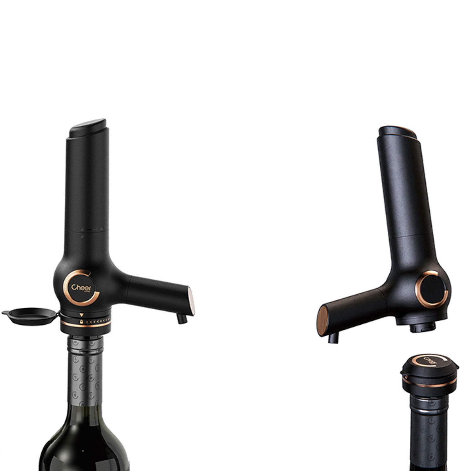 Otwórz osłonę korka, a następnie umieść dyspenser Connoisseur na górze. Naciśnij i obróć go, zgodnie z ikonami blokady na korku. Naciśnij przycisk na górze urządzenia, aby dozować wino ze stałą szybkością przepływu.