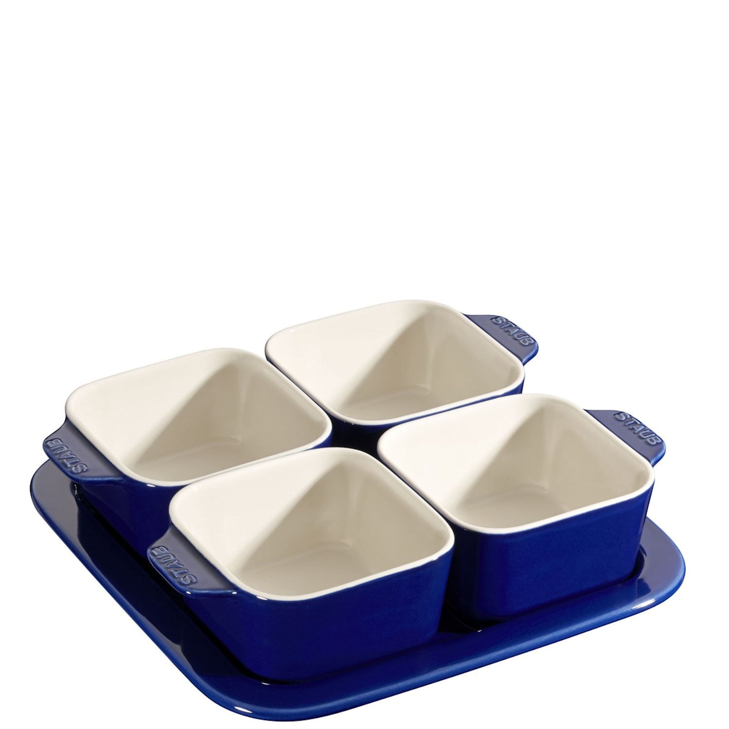 Uroczy i praktyczny zestaw do podawania przystawek, złożony z czterech kwadratowych naczyń oraz podstawki. Świetnie sprawdzi się do serwowania zimnych przekąsek, dipów czy past, ale może służyć również do podania ciepłych przystawek. Naczynia mogą służyć do podgrzania dań w piekarniku, a potem być serwowane prosto na stół.