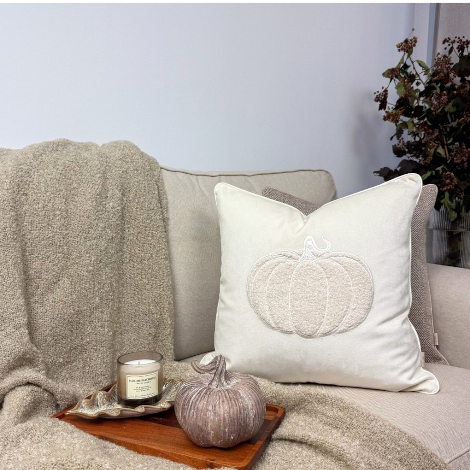 Połączenie miękkiej, gładkiej tkaniny z wypukłą strukturą haftu na tkaninie boucle, tworzy elegancki i jednocześnie naturalny efekt, który pięknie dopełni aranżację salonu, sypialni czy przytulnego kącika do odpoczynku.