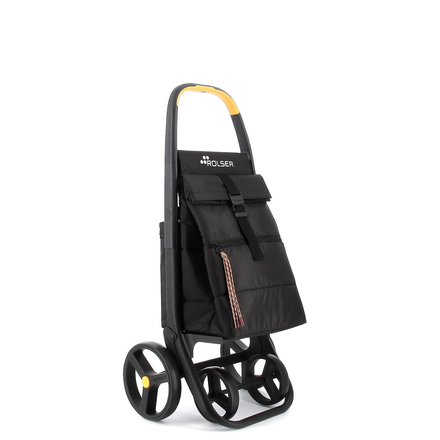 Lekki stelaż z żółtymi wykończeniami z tworzywa z recyklingu, wyposażony w system 2/4 kółek, który eliminuje konieczność noszenia zbędnego ciężaru. Torba o dużej pojemności z pikowanego materiału, z podwójną kieszenią wewnętrzną, przednią kieszenią zapinaną na zamek oraz tylną kieszenią termiczną.