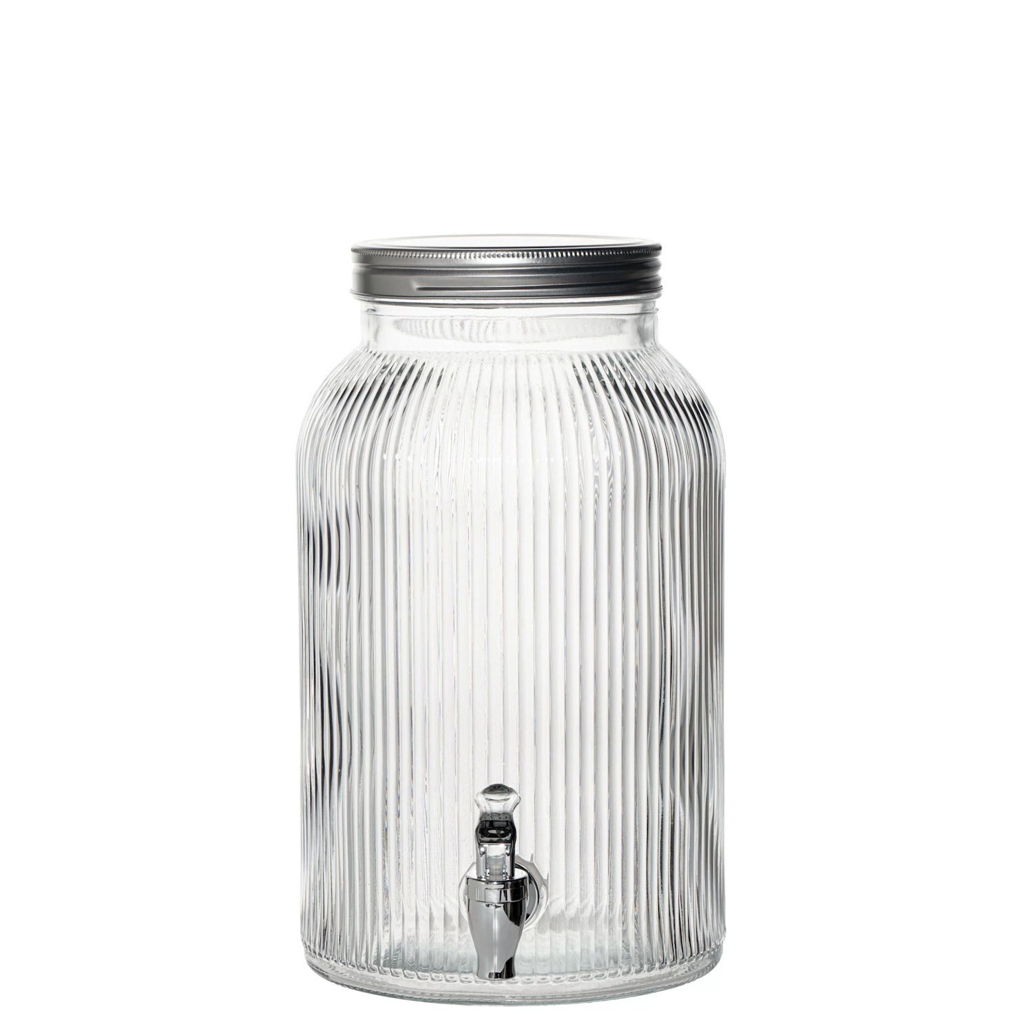 Wykonany z ryflowanego szkła, prezentuje się wyjątkowo efektownie, a szeroki wlew umożliwia łatwe napełnianie oraz dokładne czyszczenie. Praktyczny kranik z tworzywa imitującego stal ułatwia wygodne nalewanie napojów, natomiast metalowa pokrywka skutecznie chroni zawartość słoja np przed owadami.