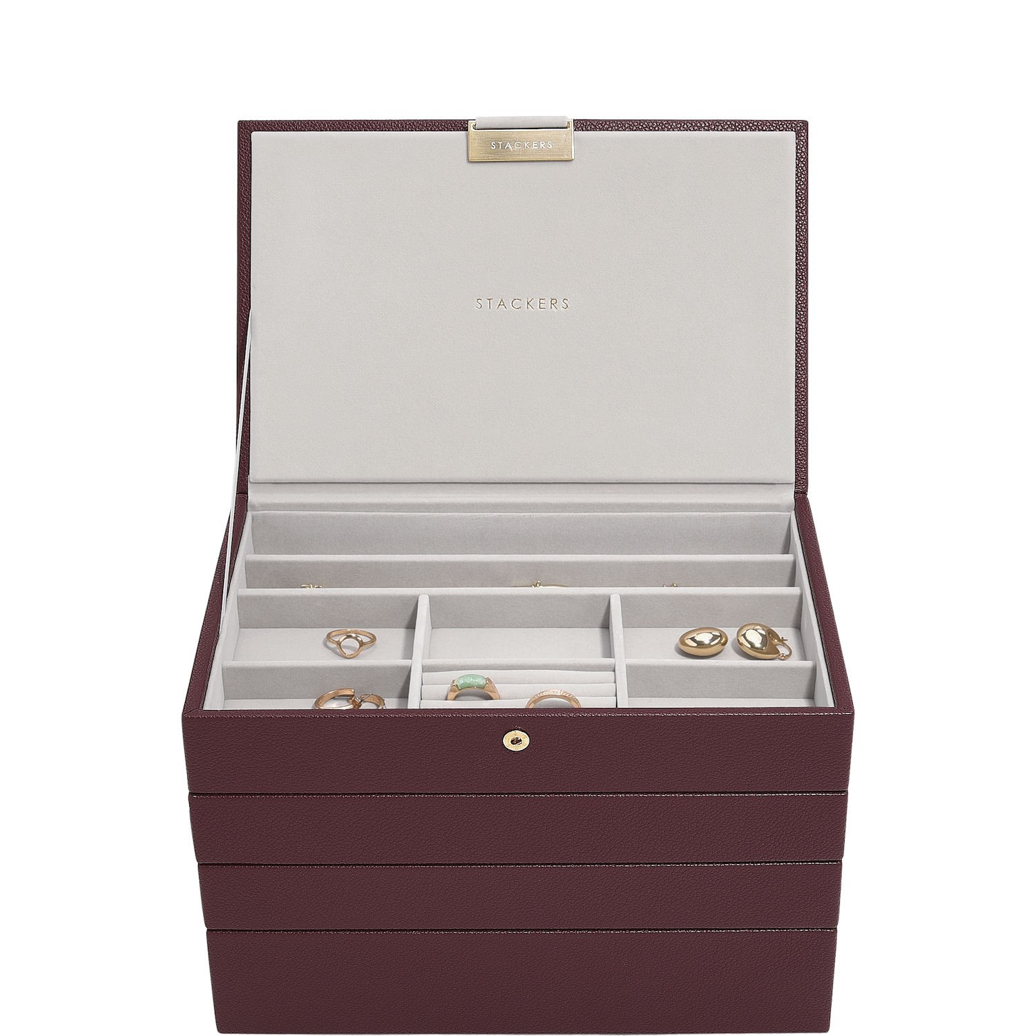 Bardzo elegancko prezentuje się na szafce czy półce. Wyposażona jest w 4 niezależne od siebie poziomy z przegrodami na biżuterię, które różnią się wielkością i głębokością. Są przeznaczone zarówno na drobną biżuterię np. kolczyki, jak i większe np. bransolety czy naszyjniki. Niektóre przegródki są wyposażone w rolki na pierścionki. Wewnątrz znajduje się syntetyczna, miękka wyściółka chroniąca biżuterię przed zarysowaniem. Szkatułkę można zabrać ze sobą w podróż, posiada u góry zatrzask.