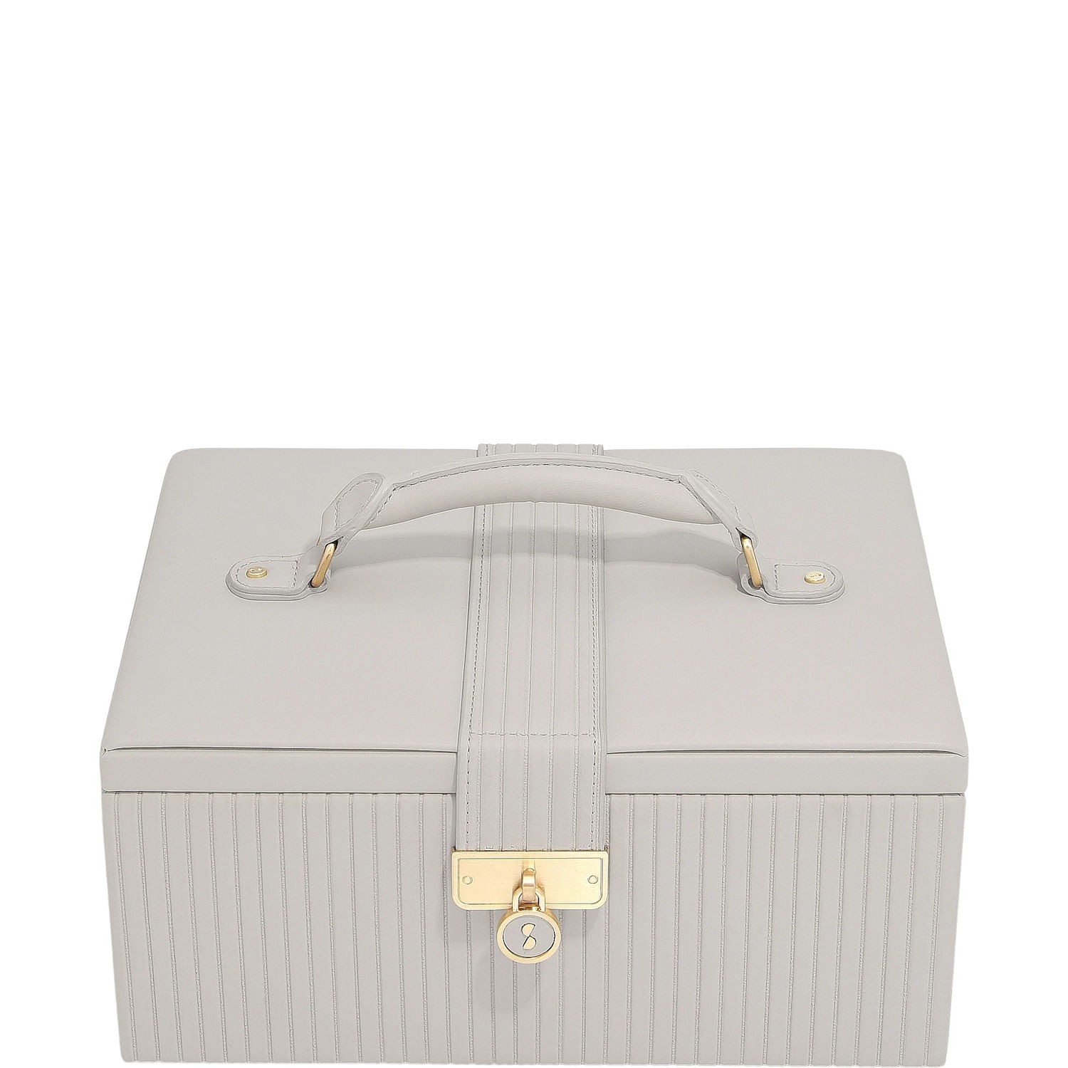 Bardzo elegancko prezentuje się na szafce czy półce. Eleganckie wykończenie ze skóry ekologicznej oraz złote detale z zapięciem i kluczykiem sprawiają, że szkatułka jest luksusową ozdobą każdego wnętrza. Dwupoziomowy układ z  przegródkami na biżuterię pozwala na idealne uporządkowanie swoich kolekcji. Górna część zawiera rolkę na pierścionki i kolczyki, długie przegródki na naszyjniki oraz kolejne przegródki na bransoletki i kolczyki. Dolna część pomieści większe akcesoria, takie jak zegarki czy bransolety, a nawet mniejszą, podróżną szkatułkę.