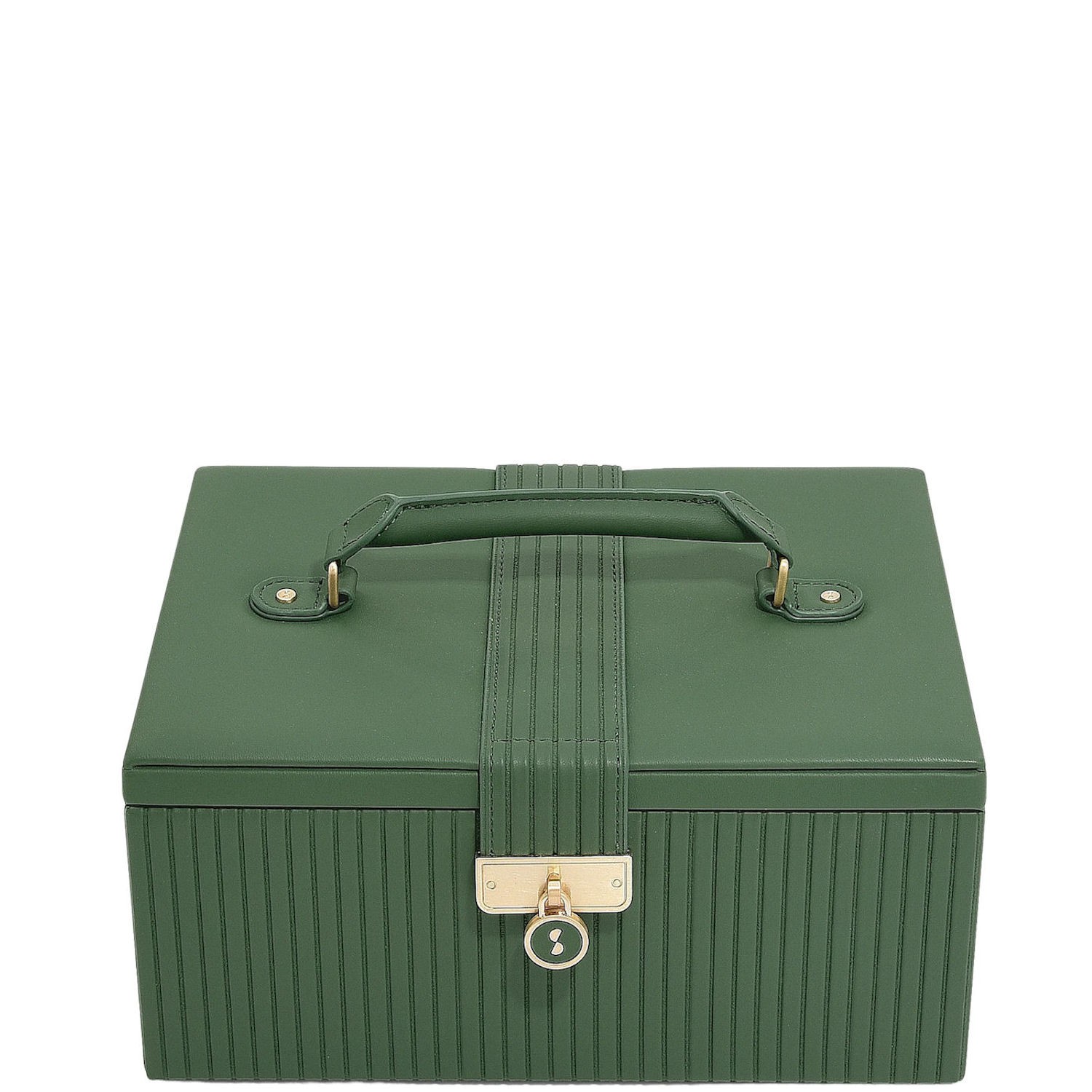 Bardzo elegancko prezentuje się na szafce czy półce. Eleganckie wykończenie ze skóry ekologicznej oraz złote detale z zapięciem i kluczykiem sprawiają, że szkatułka jest luksusową ozdobą każdego wnętrza. Dwupoziomowy układ z przegródkami na biżuterię pozwala na idealne uporządkowanie swoich kolekcji. Górna część zawiera rolkę na pierścionki i kolczyki, długie przegródki na naszyjniki oraz kolejne przegródki na bransoletki i kolczyki. Dolna część pomieści większe akcesoria, takie jak zegarki czy bransolety, a nawet mniejszą, podróżną szkatułkę.