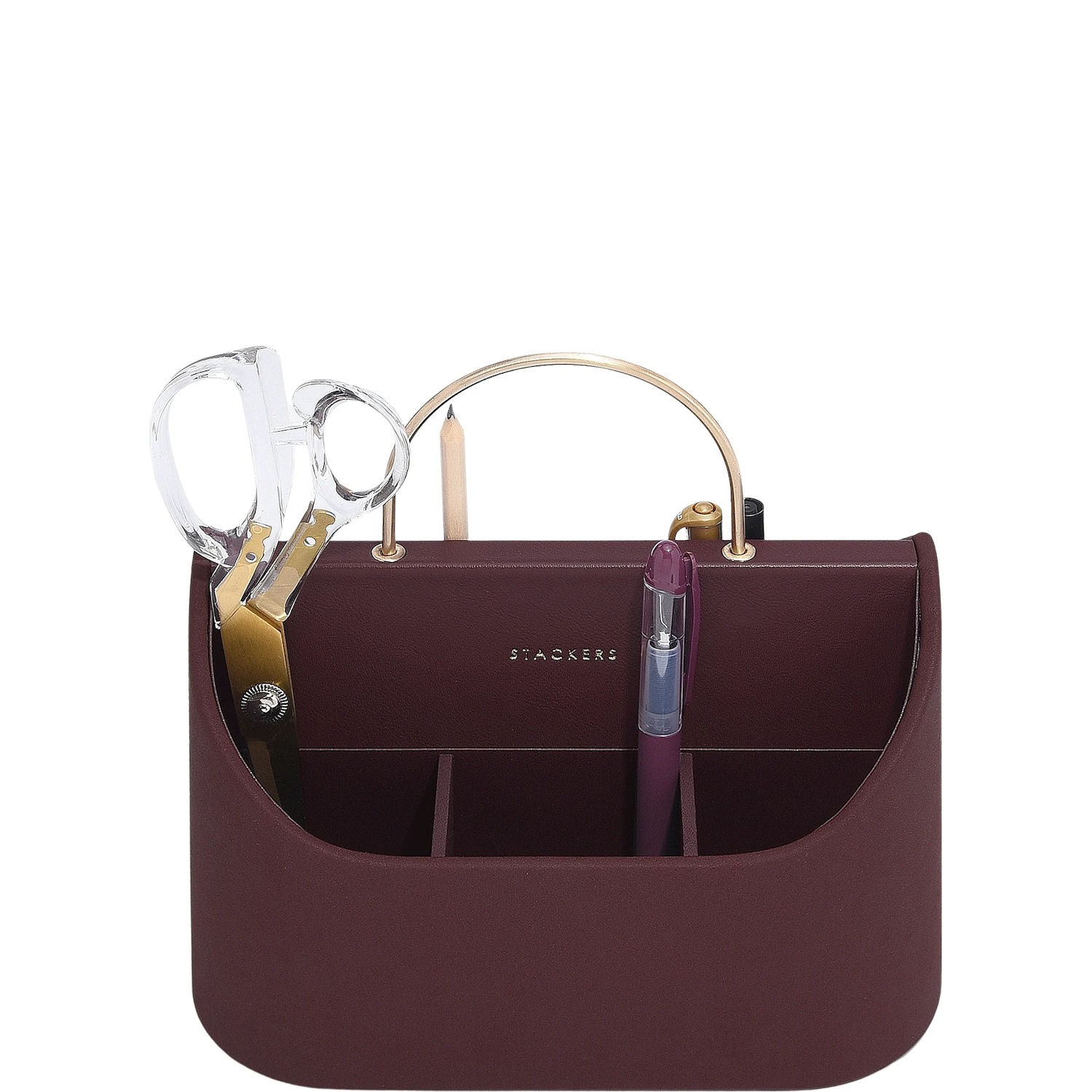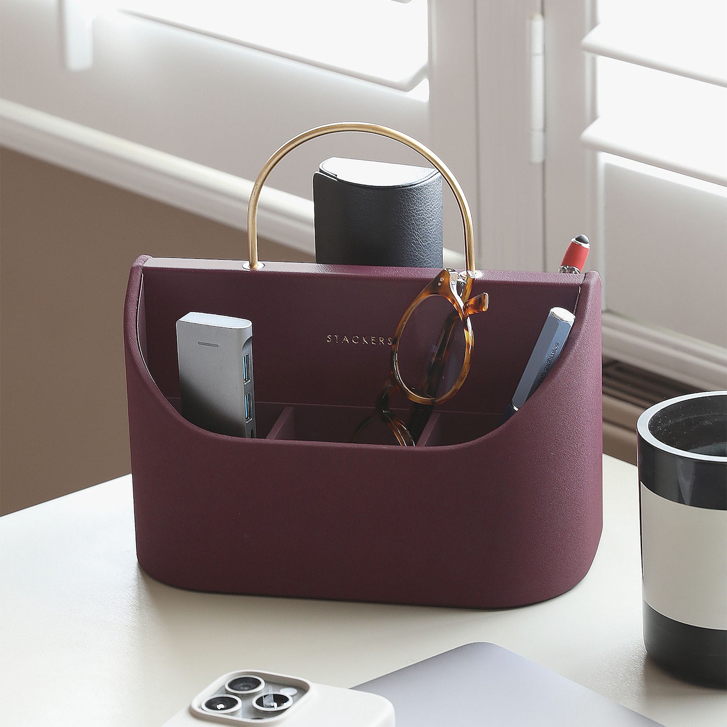 Kilka doprecyzowanych przegródek pozwoli na posegregowanie przyborów biurowych, od długopisów po kable a nawet okulary. Wygodny uchwyt w kolorze złota to nie tylko subtelny dodatek dekoracyjny, ale także pozwala z łatwością przenieść organizer w dowolne miejsce.