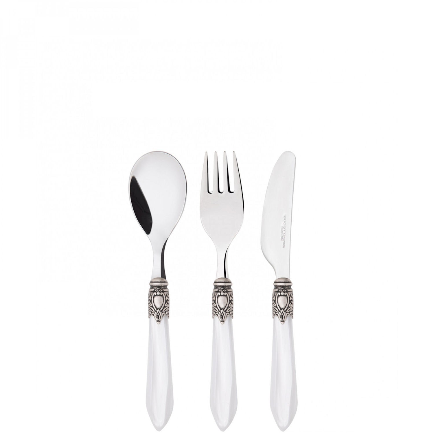 Rączki są jasne i wyglądają jak z porcelany, a przy ich górze mają piękną, srebrną ozdobę z delikatnym wzorem. Dzięki temu sztućce wyglądają bardzo elegancko dokładnie tak jak na królewskim przyjęciu! ✨