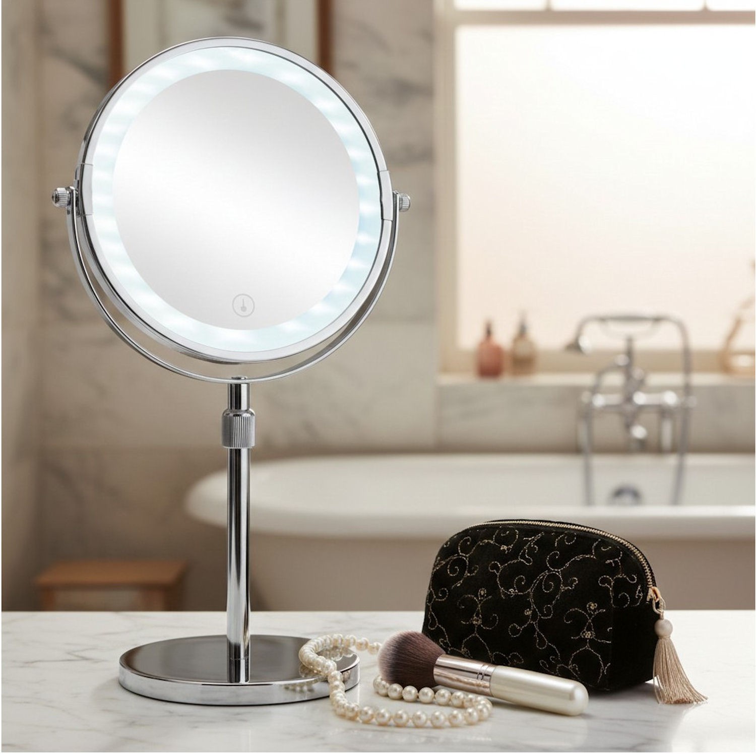 • Wbudowane oświetlenie LED – równomierny pierścień świetlny wokół tafli zapewnia naturalne i dokładne doświetlenie twarzy.