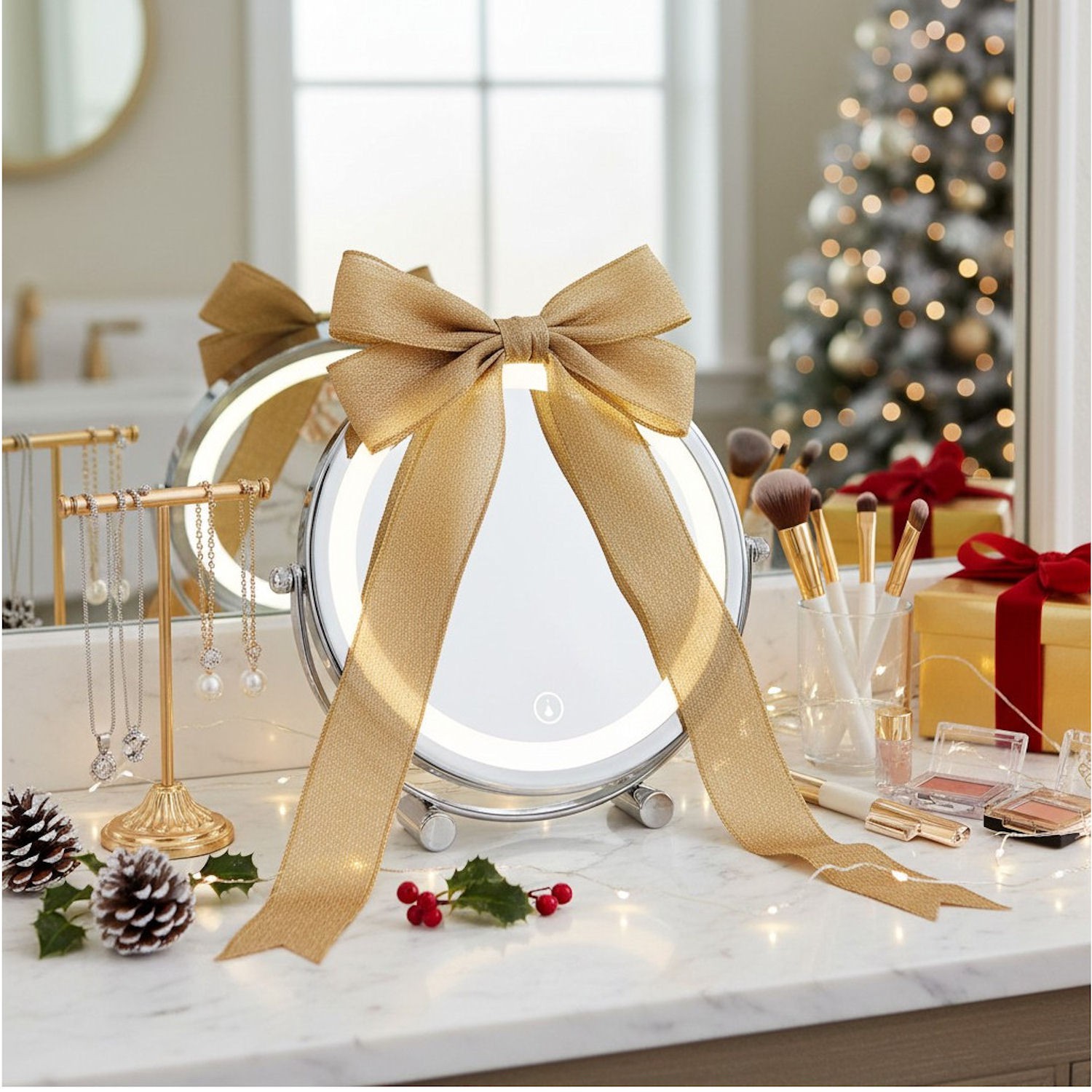 Oświetlenie LED w formie pierścienia – równomiernie rozprowadzone światło wokół tafli zapewnia precyzyjne doświetlenie twarzy, idealne do makijażu i pielęgnacji.