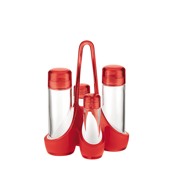 Zestaw składa się z czterech pojemników na przyprawy w dwóch wielkościach: większych po 160 ml pojemności- idealnych na przyprawy płynne, jak ocet czy magi, oraz mniejszych po 50 ml pojemności- doskonałych do soli lub pieprzu. Pojemniki umiejscowione są na stabilnej podstawie, która połączona jest ze smukłym uchwytem do wygodnego przenoszenia przypraw.